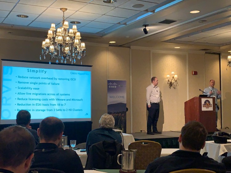 The last presentation of the day was “Build an Intent based Data Center with Cisco.” They discussed the intent life-cycle of Learn, Adapt, and Protect. Learn the network traffic, adapt to evolving threats, and protect network assets. Cisco Validated Designs, or CVDs, were also disccused. CVDs are designs validated by Cisco. So, when products are implemented per CVDs they can get better longer term support. The end of the presentation was rounded out by Vermont’s own Orvis company IT team sharing their experience with their migration to Cisco HyperFlex. With HyperFlex they replaced 18 nodes of ESXi with just 7 HyperFlex Nodes and saved a lot of money on their VMware and Microsoft licensing costs.