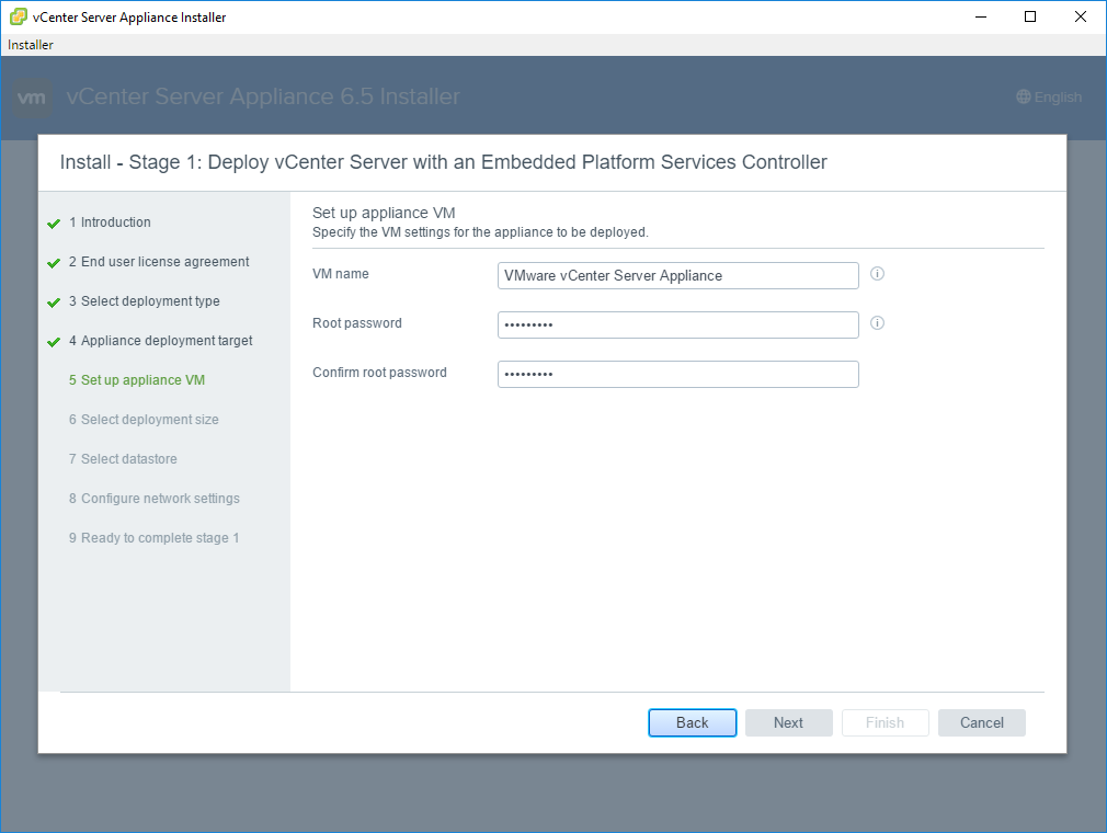 11. Setup your VCSA VM by entering in the name of the VM, this is how it will show up in vCenter and in the ESXi VM inventory. You’ll also need to enter and confirm the new VCSA root password.