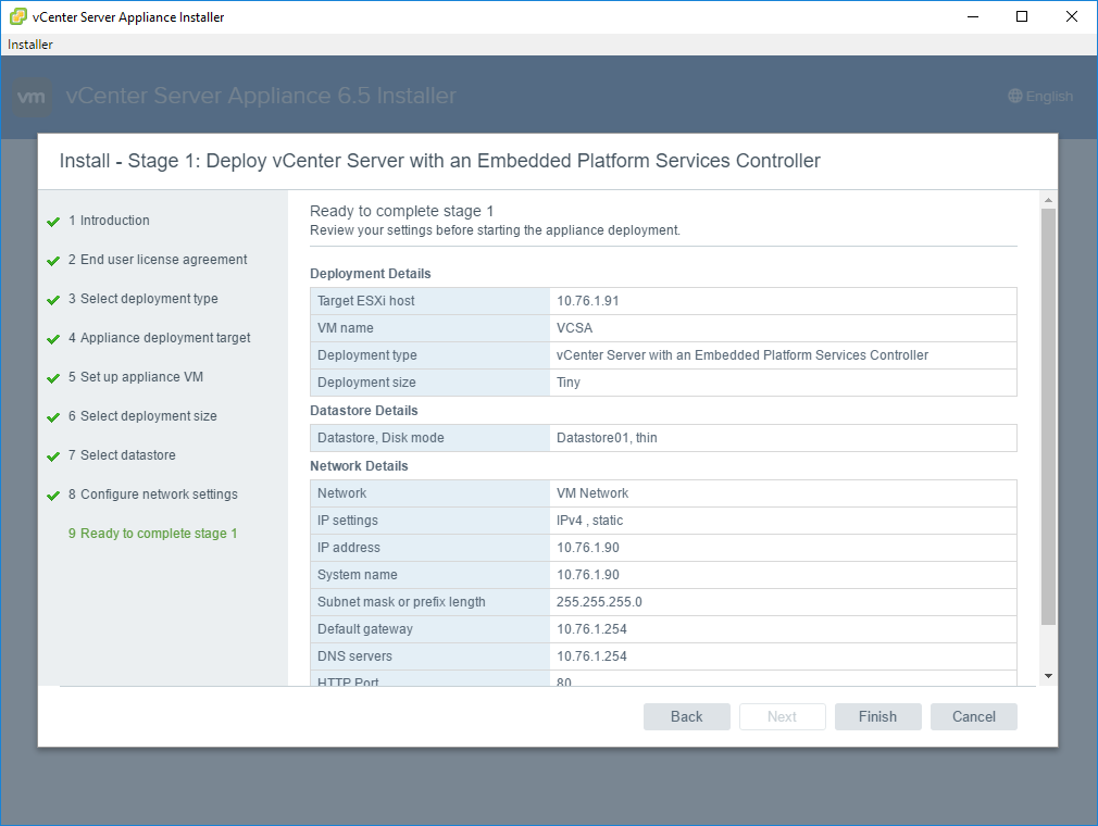 5. Review your VCSA settings and then click Finish.
