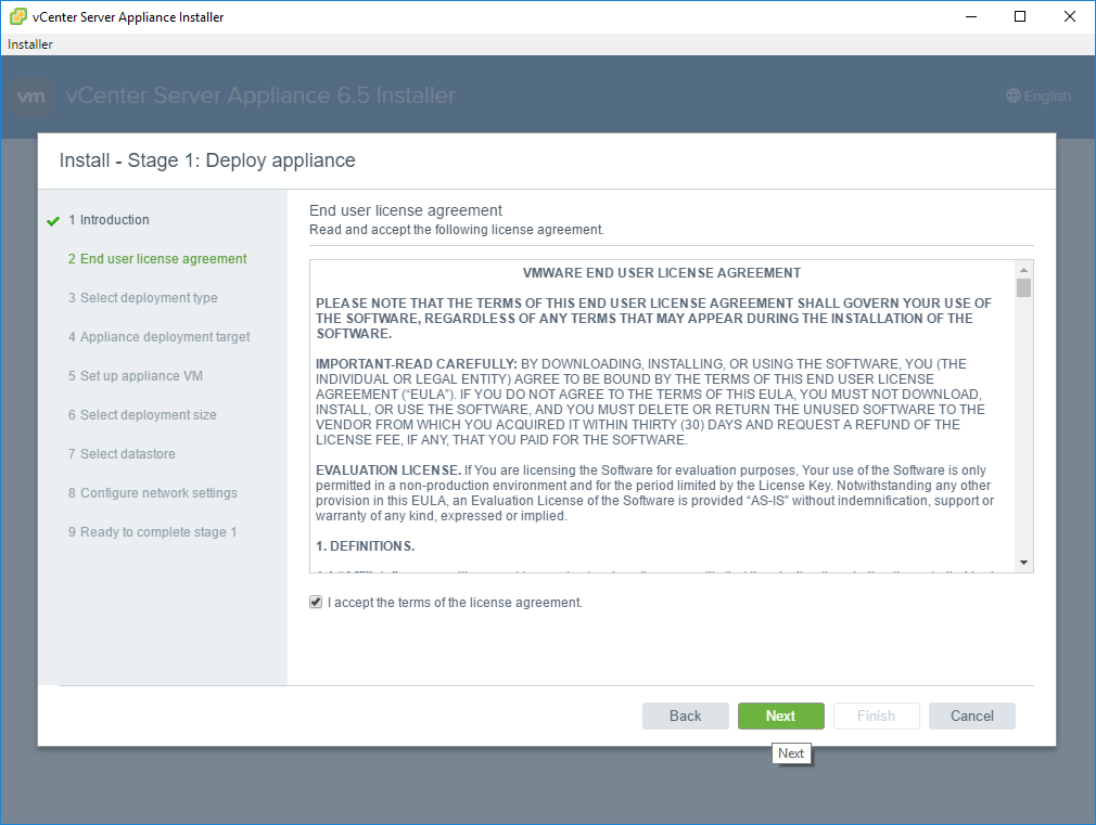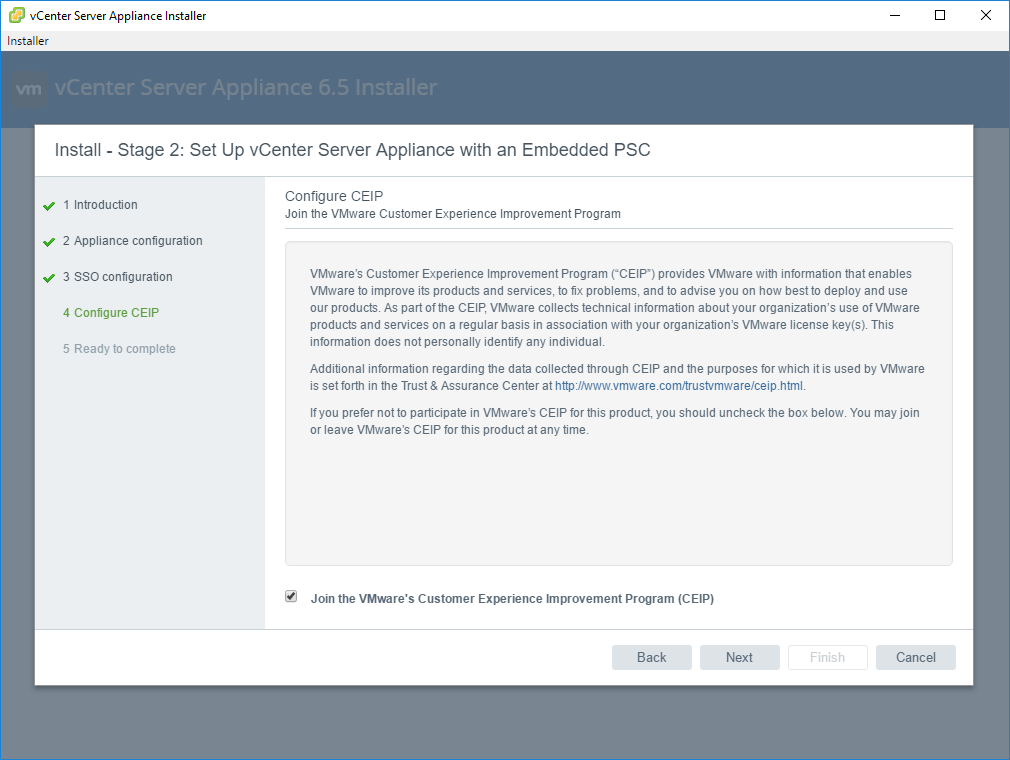 4. Customer Experience Improvement Program – this is allowing, or not, your VCSA to send data back to VMware on your installation and use. The type of information collected can be found here: https://www.vmware.com/solutions/trustvmware/ceip.html. If you want to participate leave the box checked, if you do not then uncheck the box and then click next.