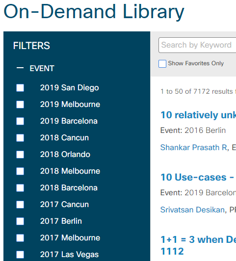 It’s also worth noting that these same sessions have been presented multiple times over the years at various Cisco Live events. You can use filters, on the left hand side of the On-Demand libary page, to view results from a specific Cisco Live event, like San Diego 2019 or Las Vegas 2017, Melbourne 2018, etc.