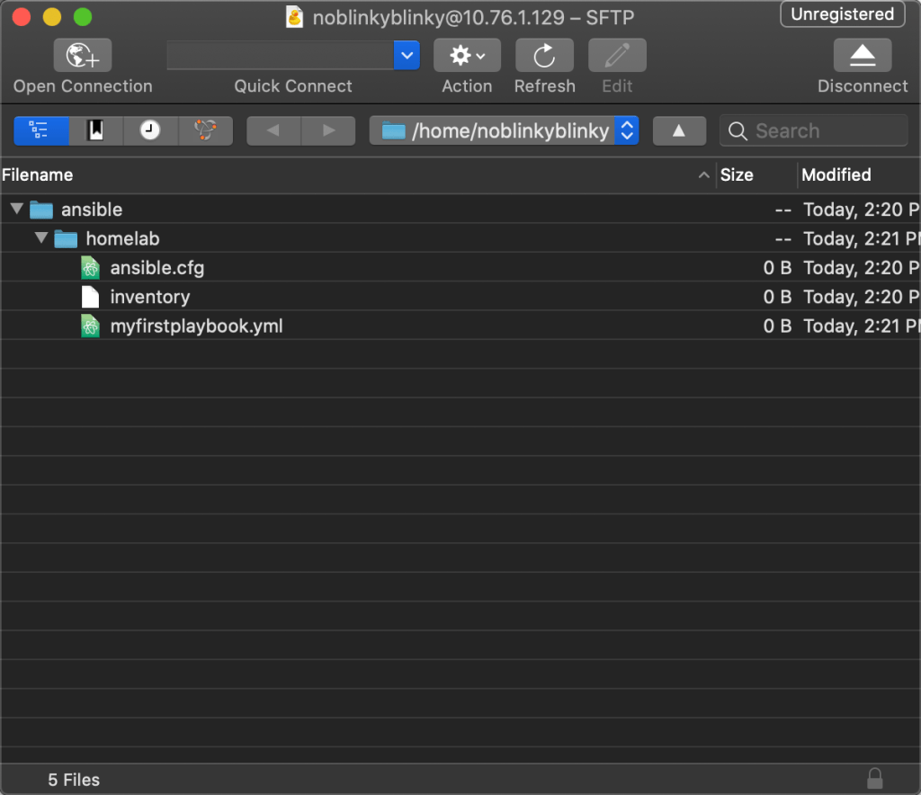 Ansible relies heavily on file and folder structures. It expects to find files of specific names in certain locations in order to function properly. Here we’ll create the base file and folder structure Ansible needs using mkdir and touch. The files will be empty, but we can use Cyber Duck to browse, open, and edit the files to our heart’s content. Then we’ll use Tree to verify what we’ve done!