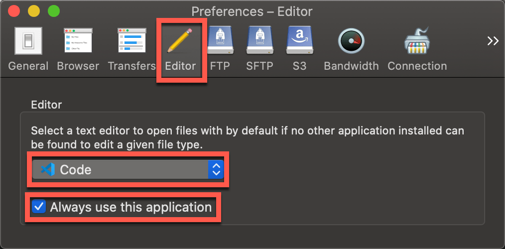 First, go to preferences and make sure that Code, or your preferred editor is set to the default editor. This allows you to open files directly from Cyber Duck directly into your editor of choice.