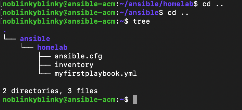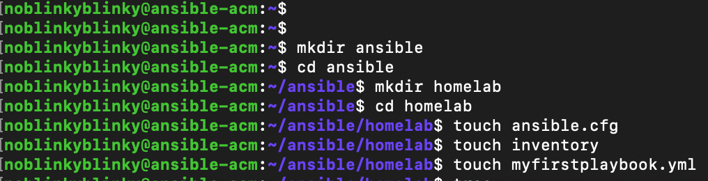 Then we can move into that folder and create some more files. Optionally, we can create a subfolder for a specific project. That allows us to have multiple inventory files and varying configurations. I like to have a folder just for my home lab. Then, I can create additional folders to try out new scenarios or other projects without impacting my home lab setup.