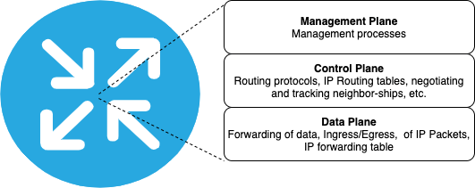 In short – the management plane is where process are managed, polices created and implemented. The Control plane is where things like routing protocols live, the IP Routing table is formed, it’s also responsible for sending and receiving traffic relating to routing like forming neighbor-ships and routing protocol updates. Lastly, the data plane is the raw forwarding of traffic it receives that transits the router.