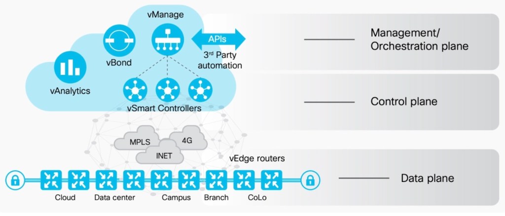 vManage is the Management plane of SD-WAN. As the Network Admin/Operator/Engineer you interact with SD-WAN via vMange GUI or API – that’s right, no. CLI here. That’s not to say you can’t SSH into the router, because you can, but don’t expect to be able to modify the configuration from there once the router is connected to vManage. The GUI and API are the new defacto methods for managing your SD-WAN routers.
