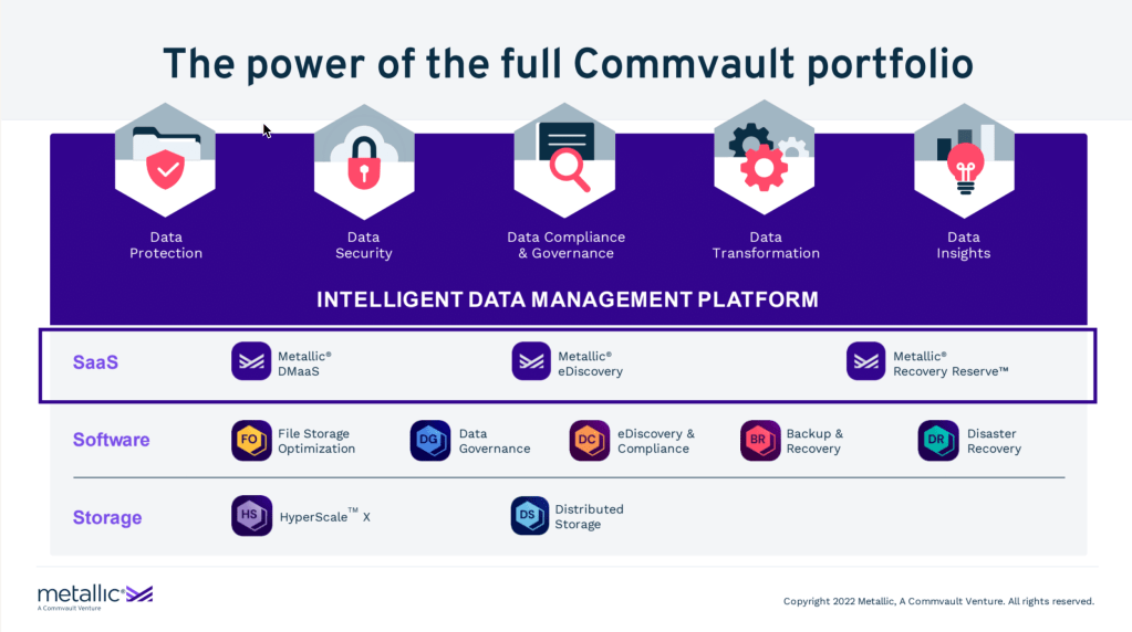 Metallic is a Software-as-a-Service (or SaaS) offering from Commvault that provides data backup and protection services. Through Metallic customers can backup Office 365, Salesforce, Microsoft Dynamics 365, VMs and Kubernetes, and much more!