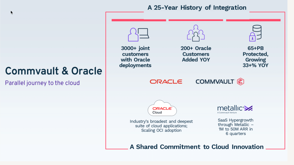 The partnership just makes sense. The two giants share over 3,000 customers together. Oracle is adding over 200 customers every year, and Commvault is protecting 65 Peta Bytes of data, and growing at an unprecedented rate!