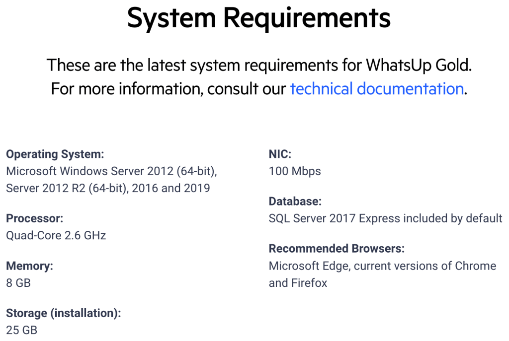 These system requirements won’t break the budget and should make it easy to spin up a virtual machine to deploy a trial of WhatsUp Gold. As of this writing, the system requirements are Windows Server 2012, 2016, or 2019, 100 Mbps NIC, Quad-core 2.6 GHz processor, 8 GB of memory, and 25 GB of storage for installation. Check this link for the most up-to-date system requirements.