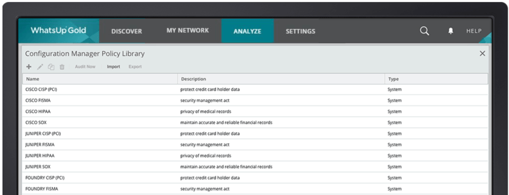 I’m no stranger to compliance! I work with tons of different customers faced with all sorts of compliance and regulation requirements. From PCI DSS, HIPPA, and SOX to name a few. With the Configuration Management module, you can manage configuration changes and be alerted when someone else makes a change. You can back up your configuration and automate the rollout of planned changes. You can also stay compliant with policies and perform regular audits of all your networking devices.